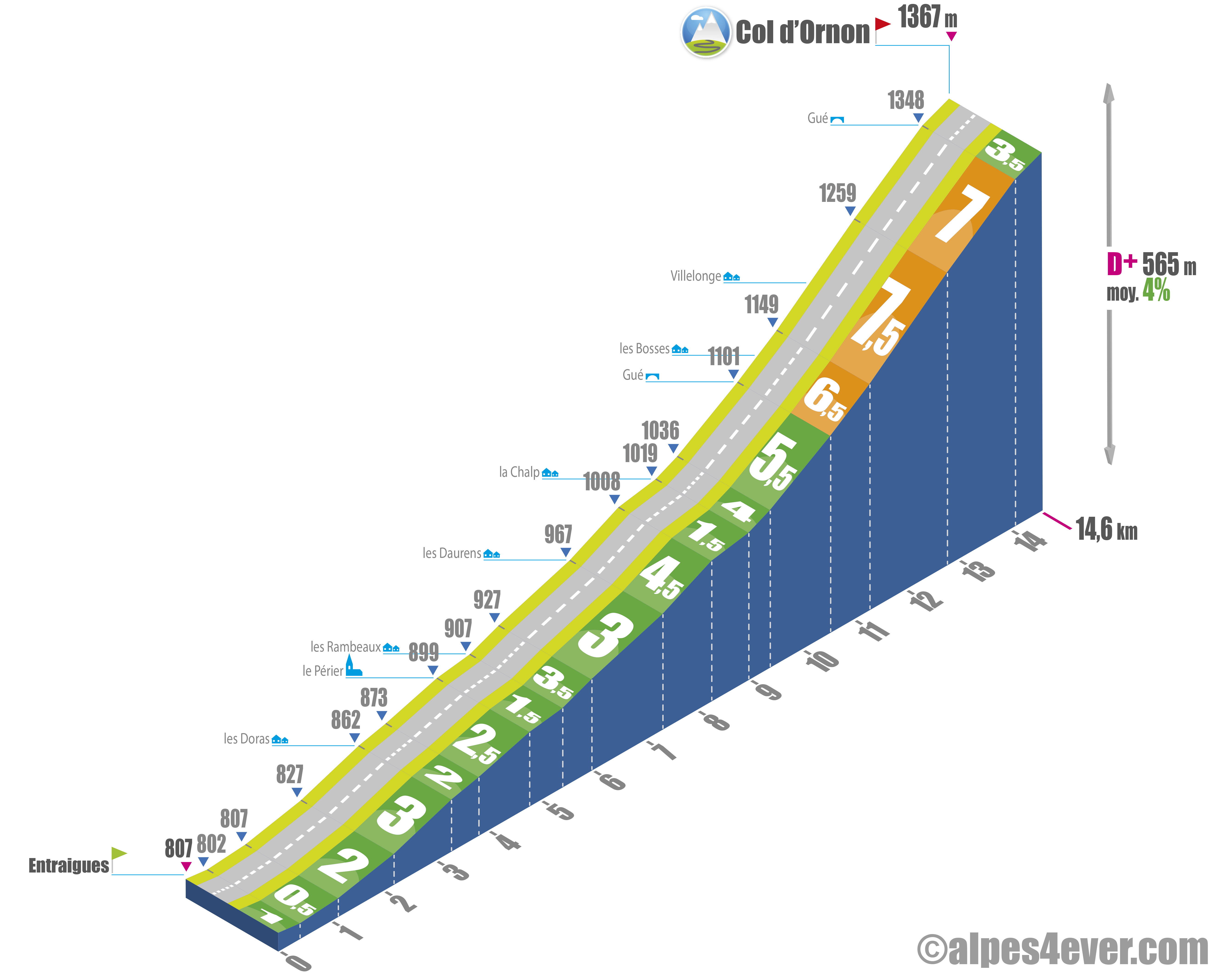 The ascent begins in Entraigues, on the south side of the col, for a 14.4 km climb with a three-stage profile.