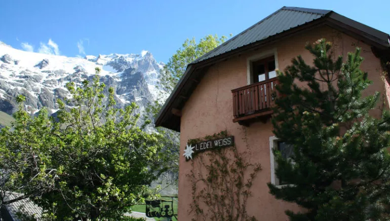 Hidden between the Northern and Southern Alps, there is a magnificent mountain, La Meije. Its peak of 3983 metres dominates the little village of La Grave. From our terrace, the peak with its glaciers give you one of the most stunning panoramas in the Alps.Auberge Edelweiss is a favourite address with bon-vivant skiers and cyclists. It is a privately owned centuries old coaching inn, situated in the heart of the 12th century village of La Grave, off the main road, and is less than 5 minutes walk from the "Téléphérique".