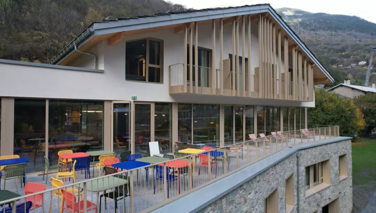 . Communal areas of over 150 m2: bar, games, shop, exhibition, outdoor terrace, and a restaurant serving local produce and traditional Savoyard cuisine using short distribution channels.