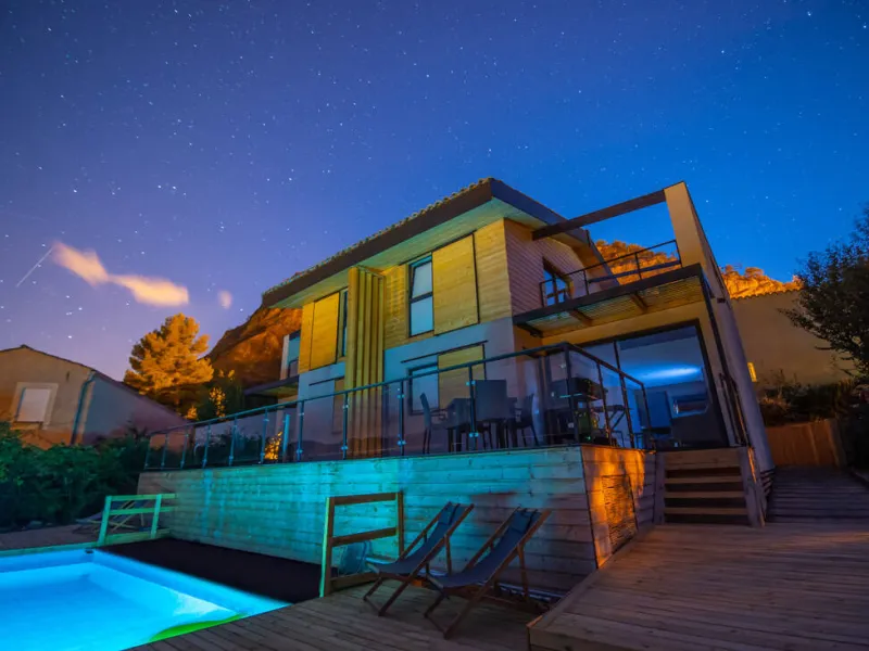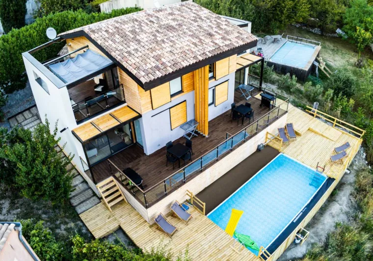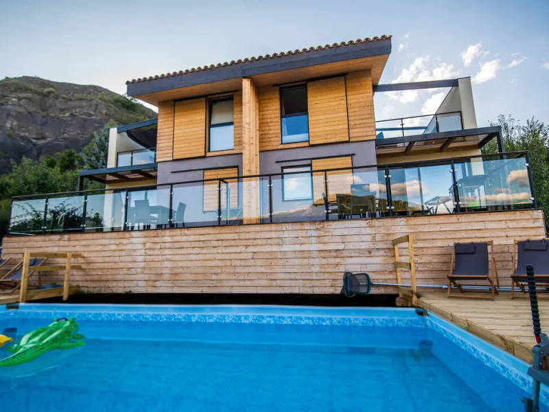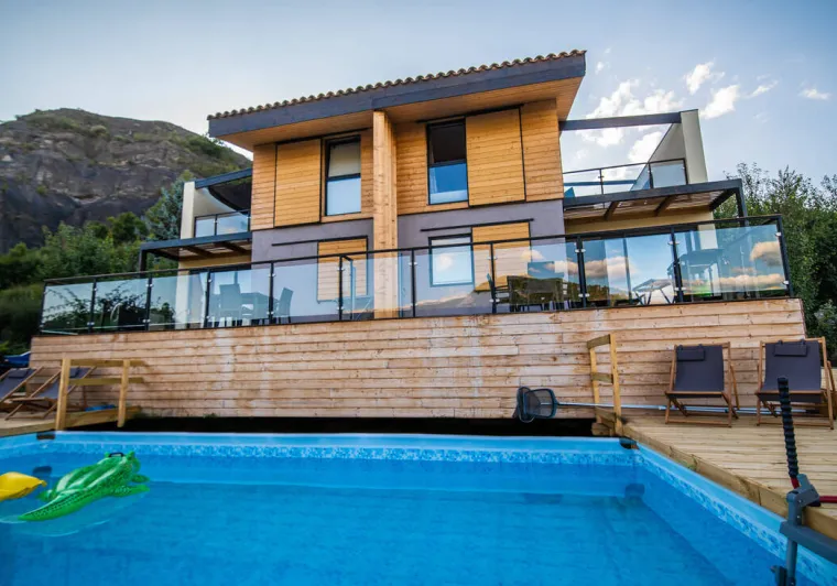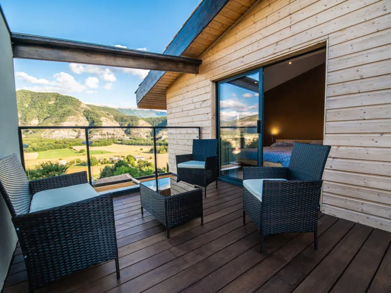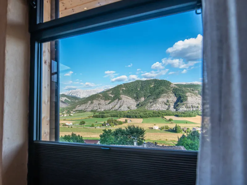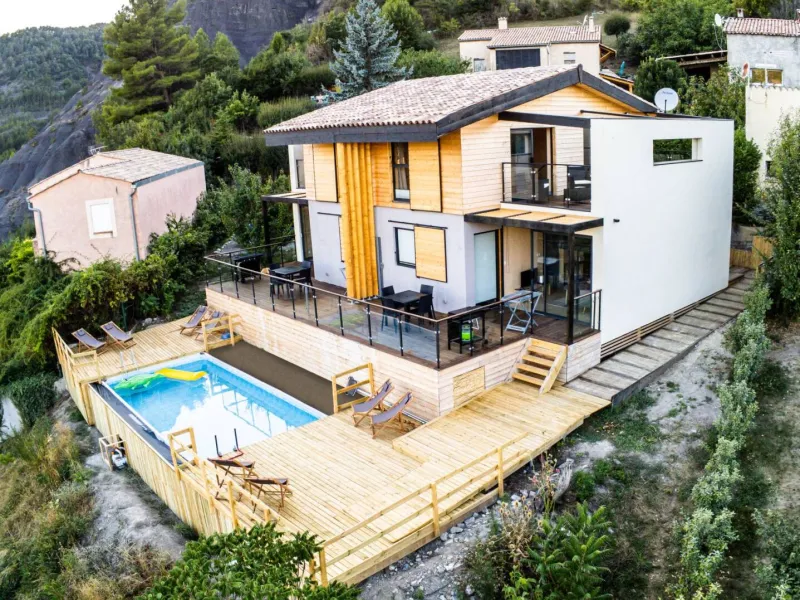 Nouvelle construction de 2021 sur pilotis avec des matériaux écologiques (Bois, chaux, argile, liège, …).Vue panoramique sur le Cheval Blanc, pic du Couard, Barre des Dourbes.