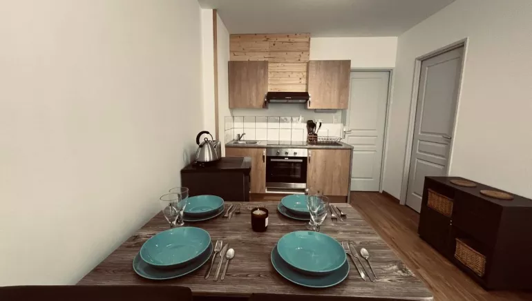 L'appartement se situe au rez-de-chaussée d'une maison de village, au centre de Bourg d'Oisans mais néanmoins dans une rue calme.Rénové en 2022, il se compose: