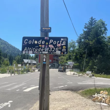 You'll still have to climb 735 m at a depressing 9% to the Biathlon Stadium. At the junction with the Chalets de Charmant Som road, a "false" Col de Porte sign doesn't quite signal the end, as you have to climb another 335 m at 6.5% to the true summit of the pass, at 1326 m.