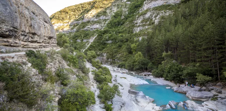The Méouge winds its way through deep, winding gorges. The river winds through magnificent landscapes created by erosion. Huge boulders with ivory-colored strata, chaotic cliffs and scree, limestone tuffs make for an unforgettable visual experience.
