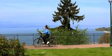 - Thonon-les-Bains : Thonon-les-Bains, with its hints of the French Riviera, is a town located beside Lake Geneva, one of Europe’s largest natural lakes. There are many sites to visit around Thonon-les-Bains: the Château de Ripaille; the little port; the Pôle Culturel de la Visitation (a former monastery turned arts centre); the Musée du Chablais; the Saint-François-de-Sales Basilica... In front of the Tourist Office, the Kilometre 0 marker is the starting point for a host of major French Alpine routes: Route des Grandes Alpes® (to be tackled by bike, motorbike or car); the Chemins du Soleil (a mountain-biking route); the Petites Routes du Soleil (for bikes); and the Grande Traversée des Alpes via the GR5 (a hiking trail).