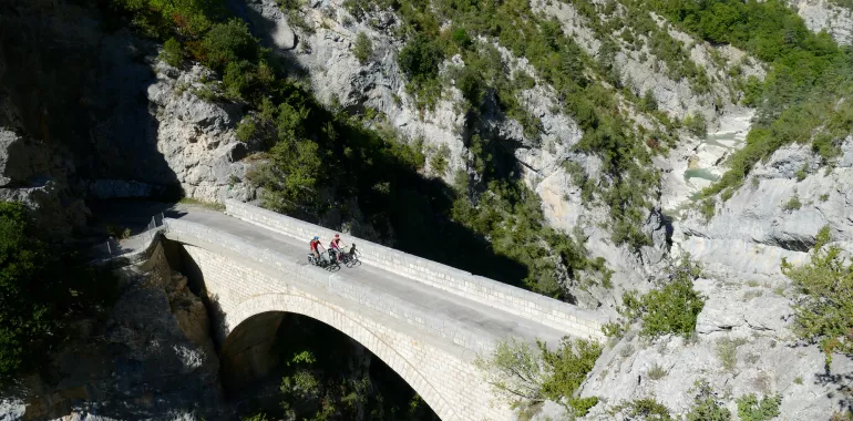 The P’tites Routes du Soleil® here makes use of the Tour des Préalpes d’Azur cycle route, crossing the regional natural park carrying the same name. You follow the Estéron River along this stretch, with its vertiginous canyons and turquoise waters. Along the way, you’ll pass by Provençal villages set against rockfaces all bathed in southern light. Much of this stage consists of descents heading south. The route leads you gently and safely to the Var’s natural balconies looking down towards the Mediterranean, your ultimate destination. Note that the Col de Pinpinier (1,136m) is one of the easiest passes over 1,000m to tackle along the whole P’tites Routes du Soleil cycle route!