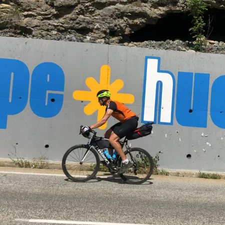 L'Alpe d'Huez, that's just mythical! It's tough, it was my first time and my first pass on the route (Tour de l'Oisans), in the cold, with 30 degrees in Bourg d'Oisans. The first hairpin bends were terrible, with sections at 12-13%. The finish in the resort is a bit "paumatic" but we eventually find the famous Rond-Point and raise our arms as if we'd won the stage! Lionel Terrail