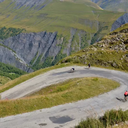 Take advantage of the beautiful view of the Lac de Chambon dam to prepare your gear. Without transition, you'll attack a terrible 1.2 km slope at 11.5%, fortunately spread over 3 switchbacks. After this intense mountaineering exercise, you'll plant your ice axe in Mizoën. A life-saving descent (1.1 km) takes you to the next part of the climb. There are 10.6 km and 824 m of ascent to climb. Apart from a refreshing 1.4 km flat at 2% between Clavans-le-Bas and Clavans-le-Haut, the last traces of human civilization, the gradient will hardly ever fall below an average of 7%, often rising to 9/10%. The last 4 km, spread over 10 hairpin bends on a gradient of between 9 and 10%, are Dantean! But you'll be able to enjoy a magnificent panorama of the Plateau d'Emparis and the peaks of the Massif des Écrins.