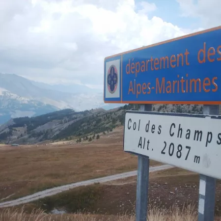 The Col des Champs sign is on the right side of the road. The sign for the Col is on the Alpes-Maritimes side. There are no restaurants or other facilities at the summit, just a parking lot and a commemorative stele. One of the few passes over 2,000 m not polluted by tourism! It's easy to see the geographical pass a little lower down in the middle of the mountain pastures, but the track is quite rocky and not very accessible by road bike.