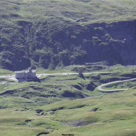 in a mineral setting. Altitude 1940 m at PK24.3, the Col du Petit Saint Bernard is in sight and seems quite close, but everything is often deceptive in this situation. Take a look at your speedometer, there's still some 5.6 km to go. You can admire the Sommet des Rousses (2878 m) and the pointe de Lancebranlette (2936 m). The panorama is superb, a little marred by the huge electrified line linking Bourg-St-Maurice to Italy. A bird's-eye view of Bourg-St-Maurice... 1100 meters below! On the final stretch, you wind your way up the hairpin bends - 250 m at 6% - around the former Hospice du Petit Saint Bernard and its statue. Then the road leads straight on to the pass, framed by the French-Italian customs posts. That's it, the Col du Petit Saint Bernard and its 2188 m are reached.