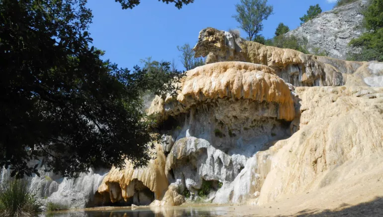 A natural curiosity is unique in the department. Formed by deposits of mineralised water, it features draperies of sparkling formations.The Fontaine Pétrifiante is constantly evolving. Water and rock are key elements of the Guillestrois region. Here, the mix has created a very special site. In the early 1980s, part of the head broke off. But it is gradually being replenished by the addition of tiny limestone particles. This fragile yet uncanny waterfall is made up of two parts: an aerial water inlet channel ending in a spillway, and a large basin in which insects, twigs and leaves are trapped in the limestone. The Fontaine Pétrifiante is a geological feature resulting from the Durance fault. The fountain water comes from a thermo-mineral spring at around 22°C, rich in gypsum and limestone. When it comes into contact with the air, the carbonate-laden water creates strangely shaped formations that constantly evolve over time....