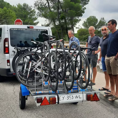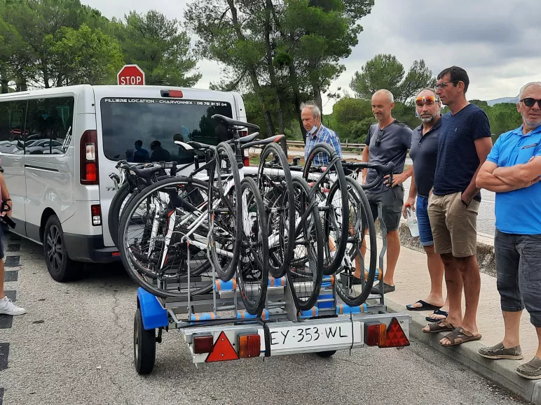 For safety and the return journey, we rented a small nine-seater van and the Thônes Cycling Club lent us a bike trailer. Two people from our entourage acted as drivers and escorts, so there were eight of us on the starting line: six on bikes (David, Emmanuel, Hervé, Jean-Marc, Samuel and myself) and two in the vehicle (François and Lionel).
