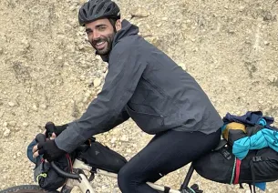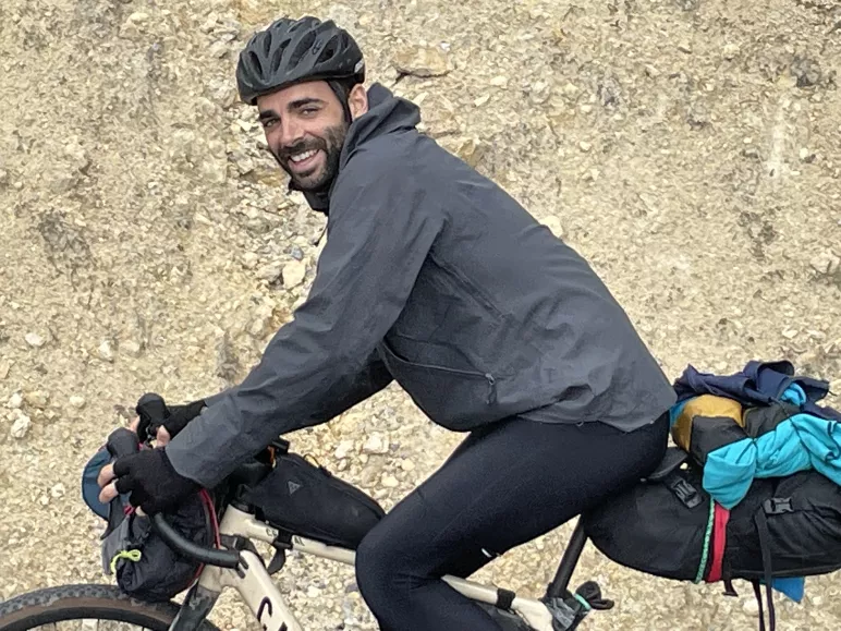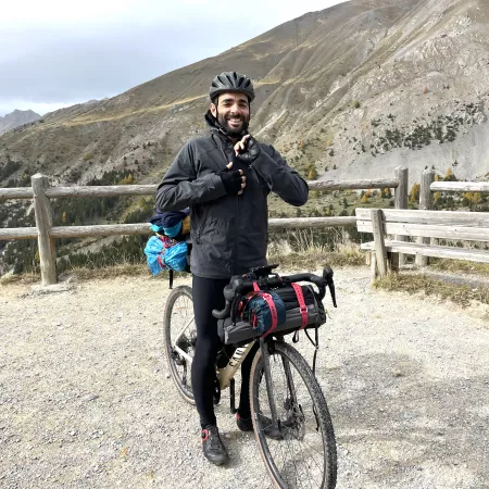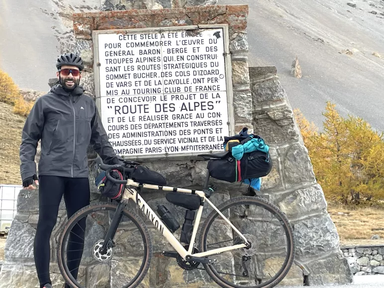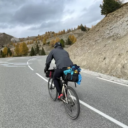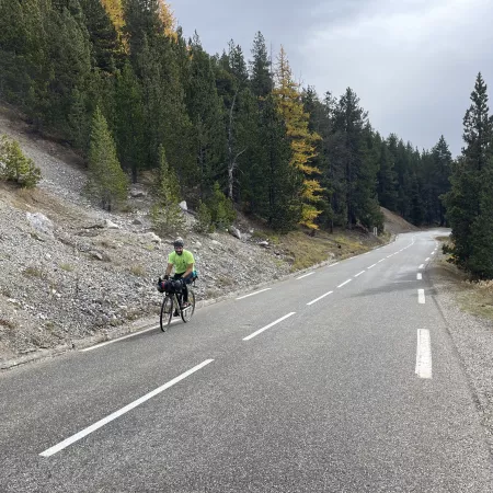 A man from Barcelona, who set off from Figueras in northern Catalonia. He crossed the Franco-Spanish border at La Jonquera, before heading down to Argelès, skirting the coast for a while, then reaching the Gard, at Saint Gilles. A hop, skip and a jump down the Rhône valley, and he's in Sisteron on the P'tites Routes du Soleil. Quick, quick, to Serre Ponçon, then the Queyras and... the Izoard via Arvieux, on the Route des Grandes Alpes®. This is where we met him, on a very wet day, and accompanied him all the way down to Briançon.